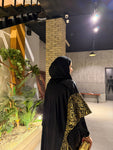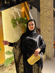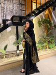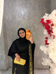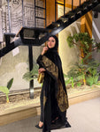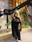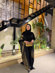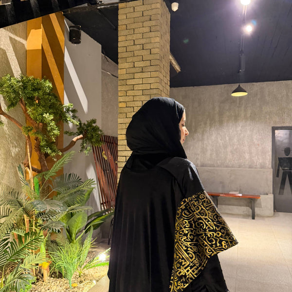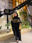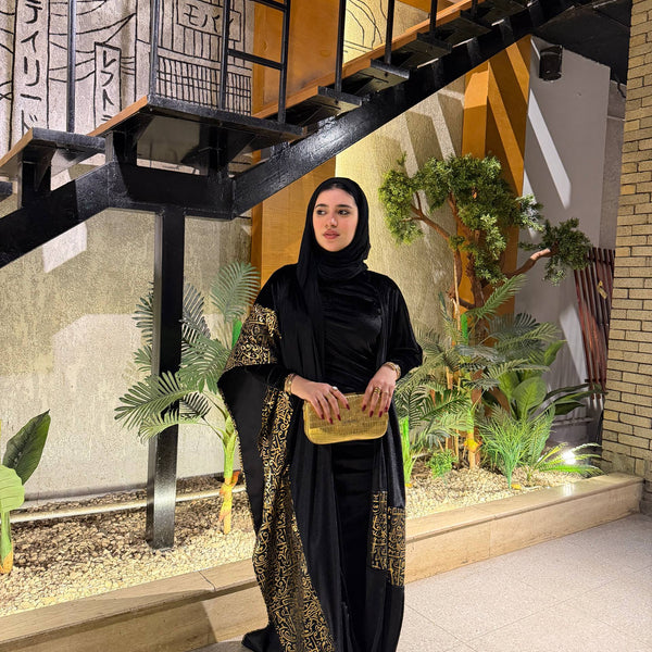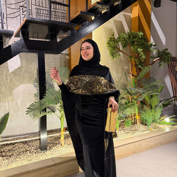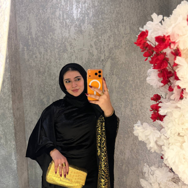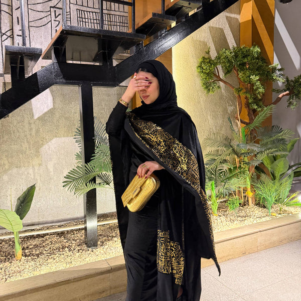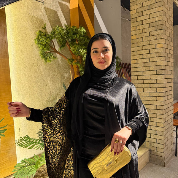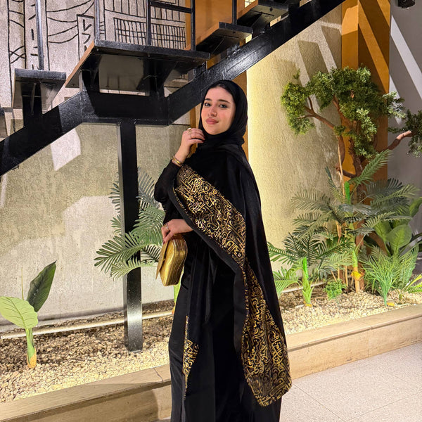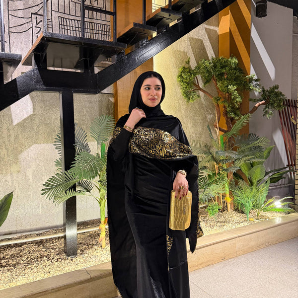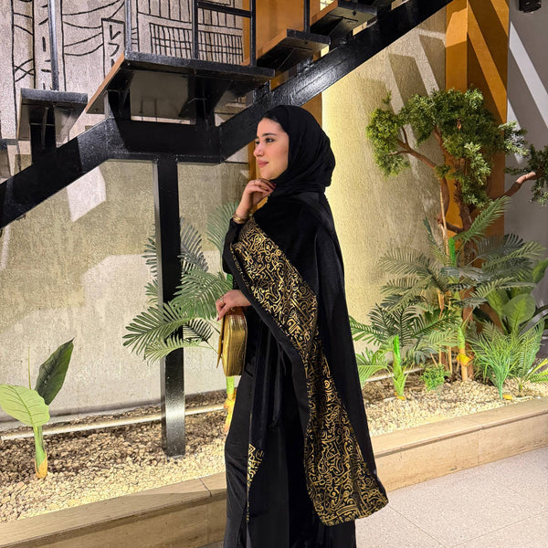 شال من القطيفة الفاخرة مزين بـ حروف دهبية بتدي القطعة طابع فخم ومميز 🖤✨