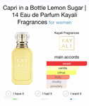 عطر Kayali Lemon Sugar هو تركيبة منعشة وحيوية تمزج بين نفحات الليمون الحمضي الحلو مع السكر، لتنطلق بعدها رائحة زهر الليمون والفريزيا والتوت التي تضفي لمسة ناعمة وأنثوية. تستقر الرائحة على قاعدة دافئة من الفانيليا والبرالين والمسك، مما يجعل العطر مثالي للاستخدام اليومي والنهاري. يأتي العطر بزجاجة أنيقة بحجم 100 مل مع تركيز Eau de Parfum يدوم لفترات طويلة، ليمنحك إحساساً منعشاً وحيوياً طوال اليوم.
