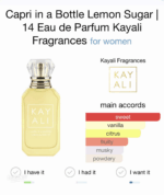 عطر منعش من Kayali بمزيج من الليمون والسكر والفانيليا، حجم 100 مل، تركيبة تدوم طويلاً للاستخدام اليومي.