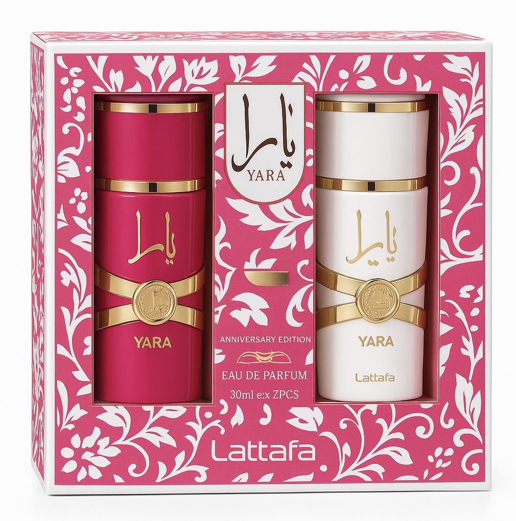 – ثنائي يارا الترافل ٢×٣٠ مل: الوردي الغورماند + الأبيض الزهري الفاكهي بتركيز EDP داخل Anniversary Edition.