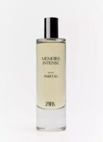 زجاجة Memoire Intense أنيقة وشفافة مع كتابة سوداء وغطاء أسود كلاسيكي، ما يعكس بساطة وفخامة العطر.