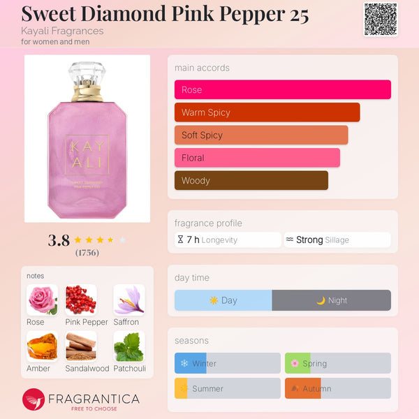 الوصف العربي: عطر سويت دياموند بينك بيبر | 25 هو مزيج جريء ومثير يجمع بين فلفل وردي وزعفران متوهّج، مع نعومة الورد البلغاري وزهرة الليلي الملكية. تأخذك تركيبته العطرية إلى أجواء فاخرة ومليئة بالطاقة، وتستقر على قاعدة خشب الصندل، المسك الحسي، والعنبر الذهبي لتمنحك حضورًا مميزًا يدوم طويلًا.